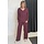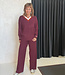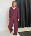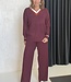 Dit bordeaux loungewear set combineert comfort en verfijnde details. Het bovenstuk heeft een V-hals en subtiele gekleurde biezen in wit en cognac, die terugkomen aan de mouwen. De geribbelde stof voelt soepel en ademend aan, terwijl de bijpassende broek met elastische tailleband met striklint en rechte pijpen, zorgt voor een goeie fit en maximaal draagcomfort.