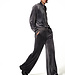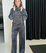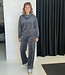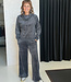 Het bovenstuk heeft een brede rolkraag met striklint, wat zorgt voor een chique en cosy uitstraling. De velours stof voelt heerlijk zacht en warm aan en geeft een subtiele glans. De bijpassende broek heeft elastische tailleband met lint en rechte pijpen, waardoor je geniet van een comfortabele pasvorm.
